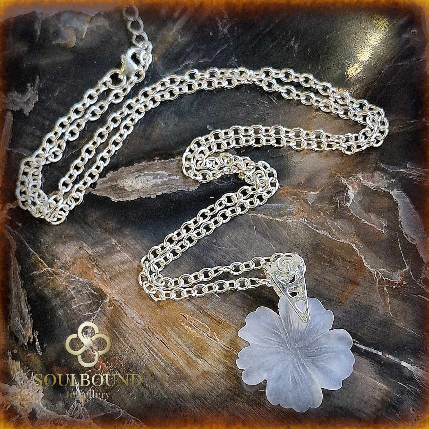Add a touch of elegance with this Quartz Flower Necklace, featuring a beautifully carved quartz flower suspended from a 48cm sterling silver chain. The perfect addition to any outfit, this necklace exudes sophistication and charm.
